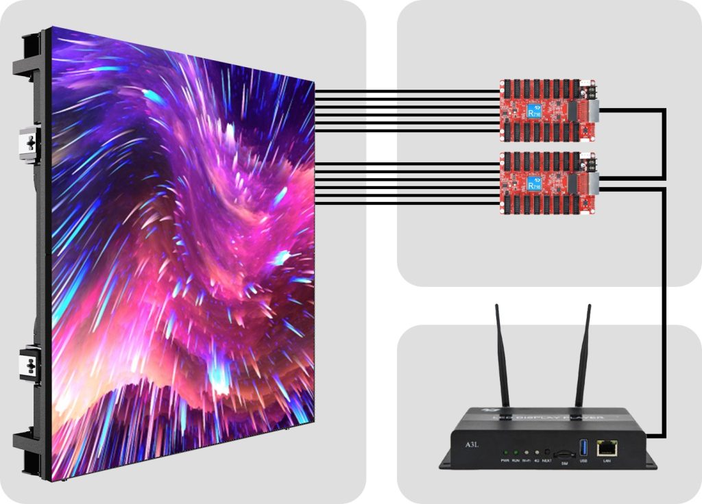 一个LED显示系统由接收卡和至少一张发送卡组成,以确保系统运行流畅、性能高效。接收卡的数量取决于每个箱体的像素密度,而发送卡的选择则基于整屏的总像素数量,以确保数据传输无延迟。